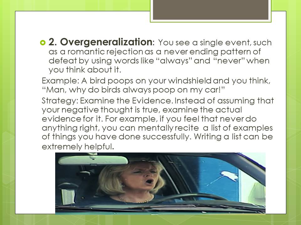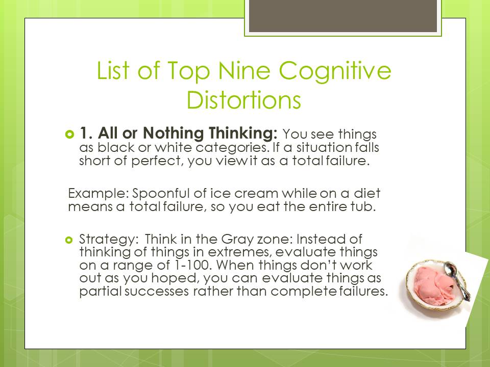While there are a myriad of cognitive distortions, below you will find my list of the top 9 cognitive distortions and more importantly the individual strategies to be able to address them.